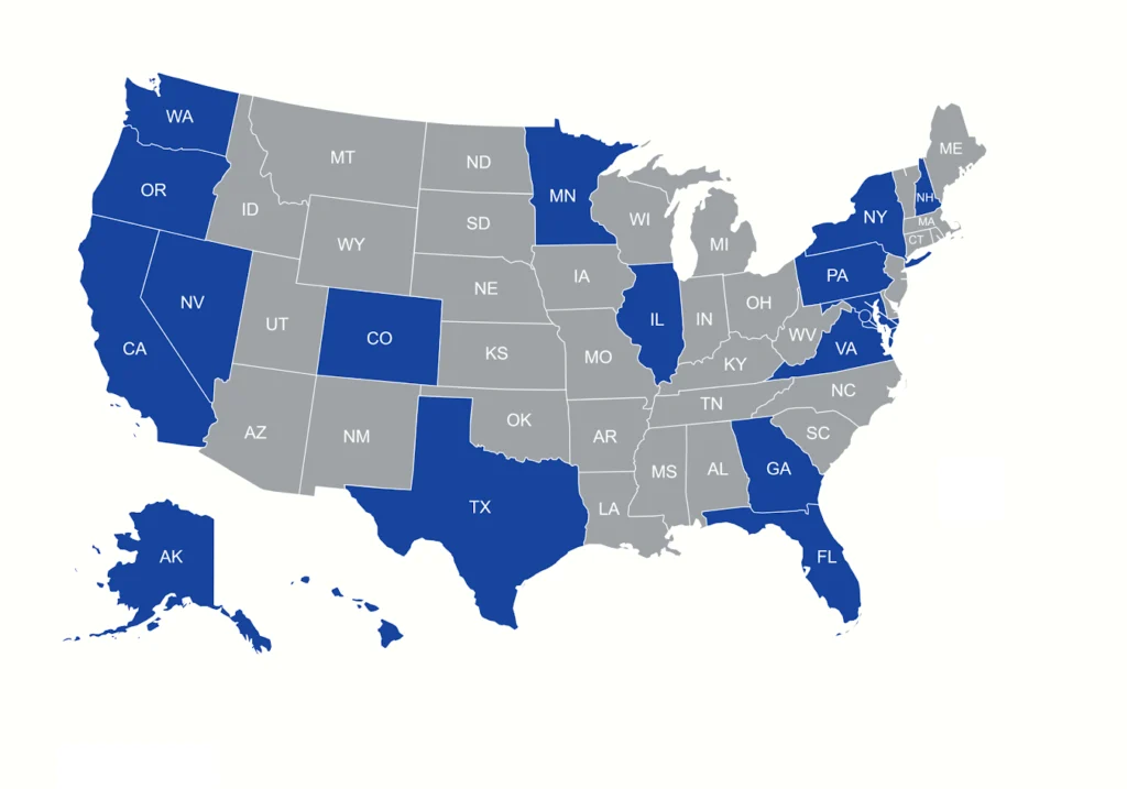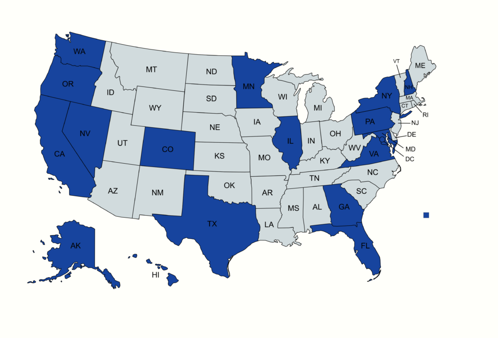 Nevada (NV) | New Hampshire (NH) | New York (NY) | Colorado (CO) | Virginia (VA) | Pennsylvania (PA) | Oregon (OR) | Washington (WA) | Florida (FL) | Georgia (GA) | Illinois (IL) | Maryland (MD) | District of Columbia (DC) | Hawaii (HI) | Alaska (AK) | California (CA) | Minnesota (MN) | Texas (TX)